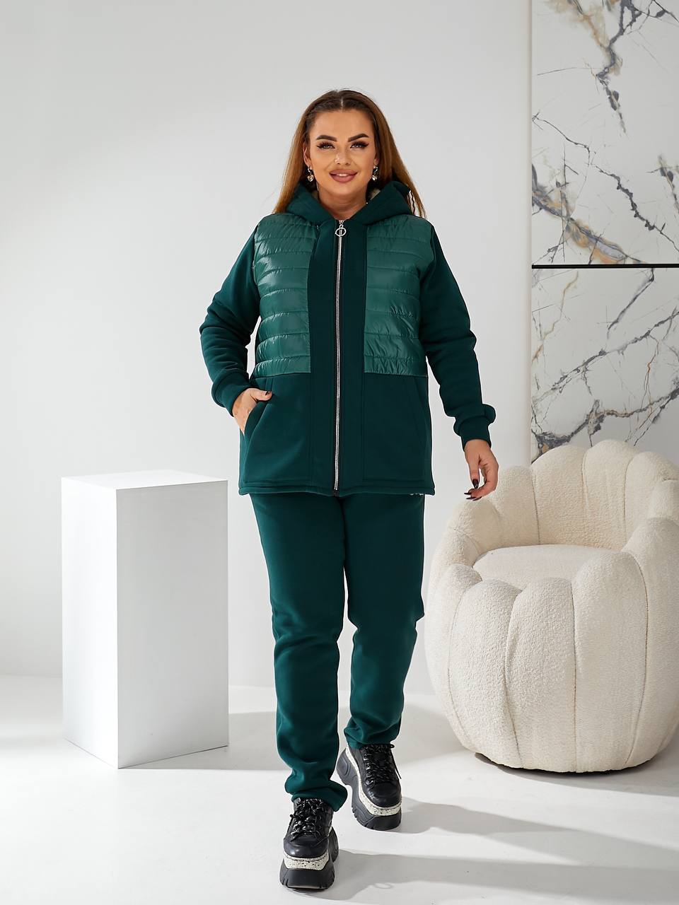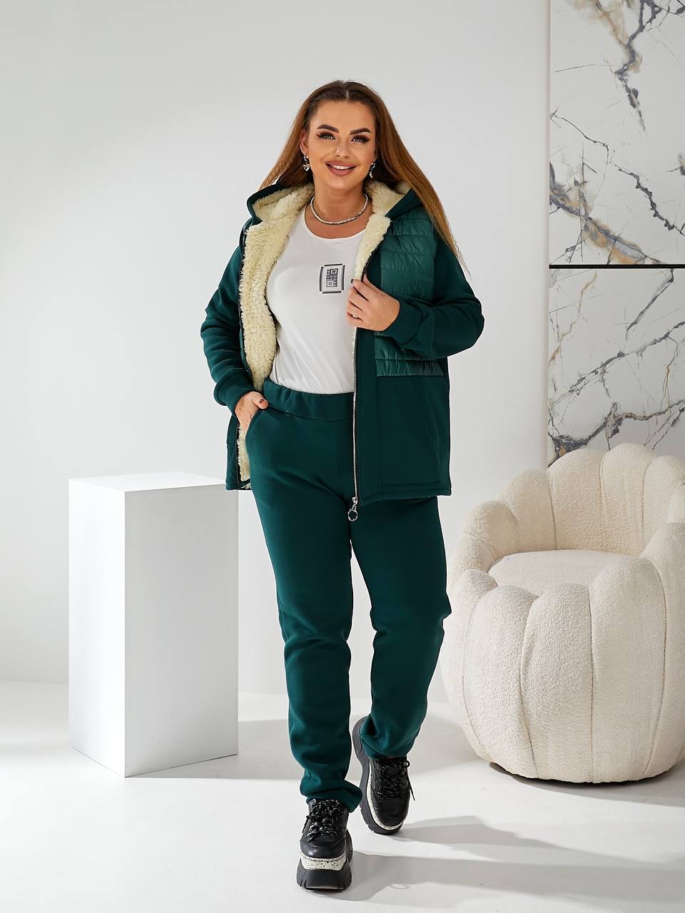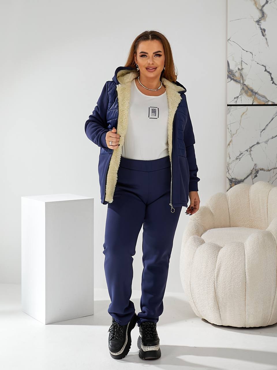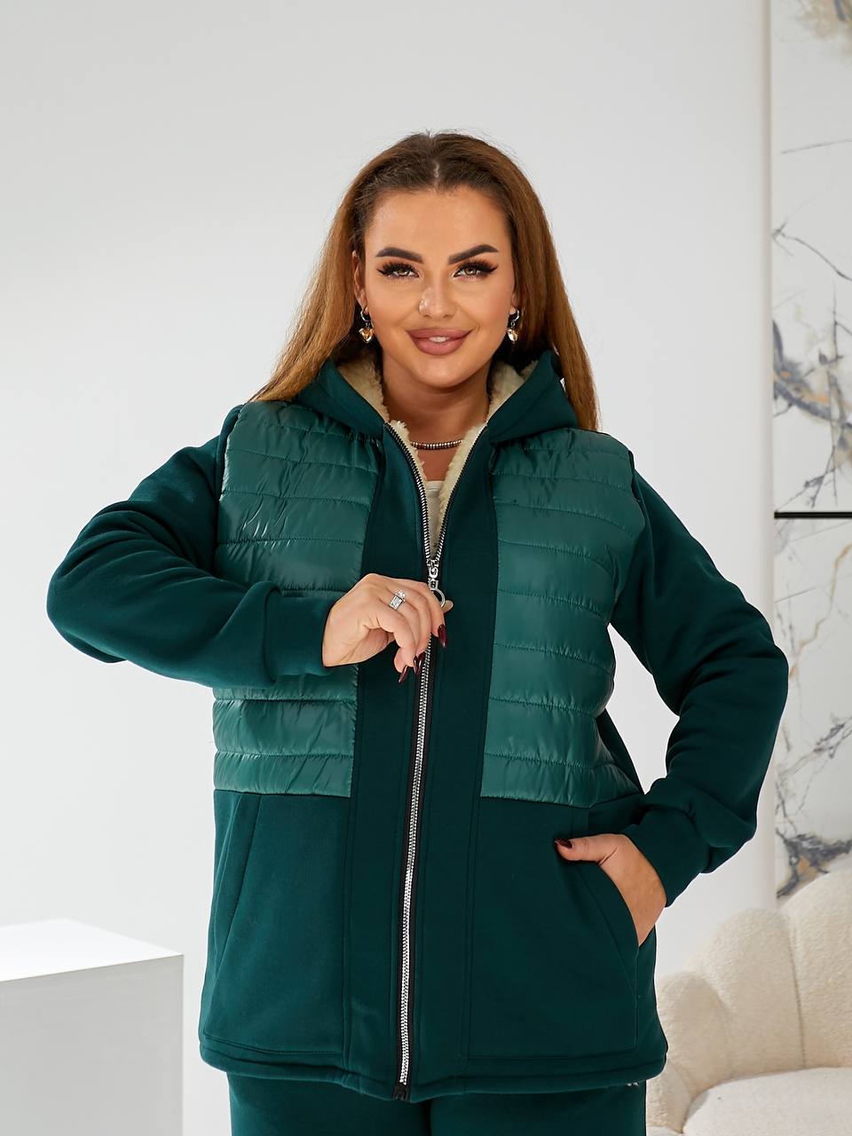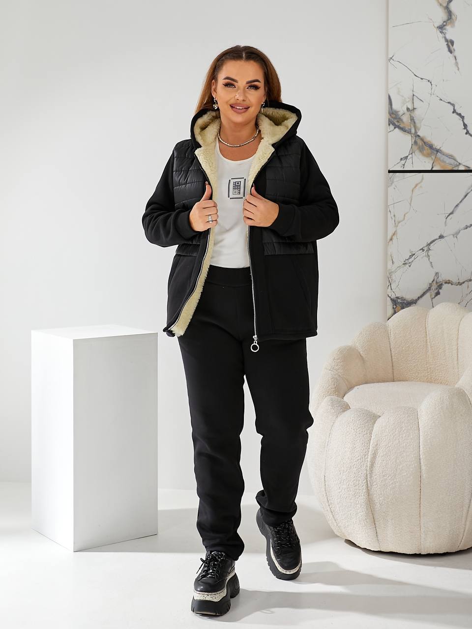 - Ткань: трикотаж 3-х нить начес, подкладка (полочка и спинка, капюшон) искусственная овчина