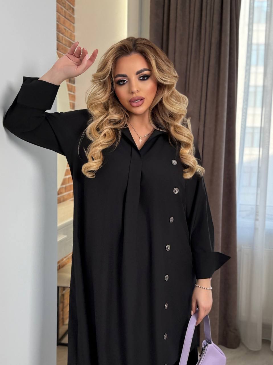 - Параметры модели – батал ОГ108, ОТ86, ОБ110, рост 165см, на ней размер 50-52