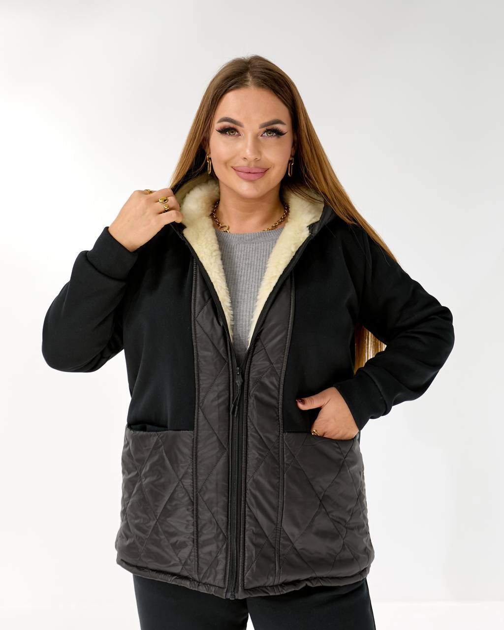 - Ткань: трикотаж 3-х нить начес, подкладка (полочка и спинка, капюшон) искусственная, плащевка лаке+ сентипон 150