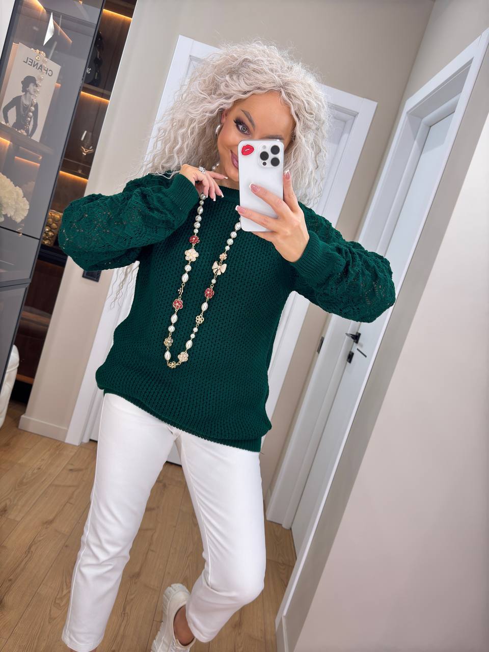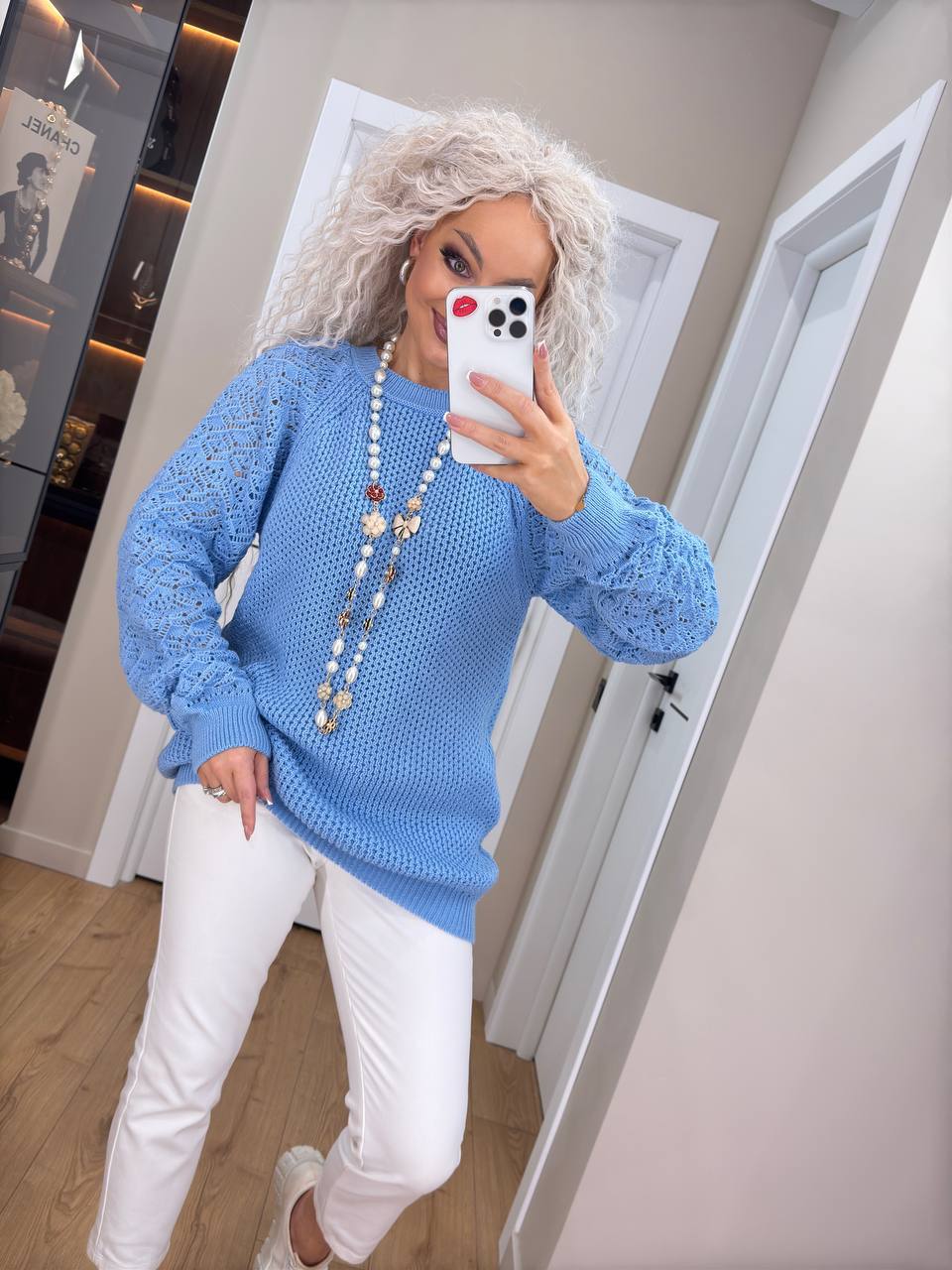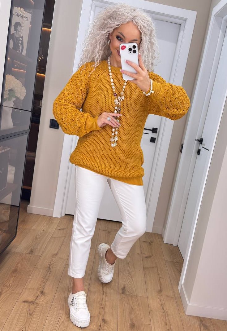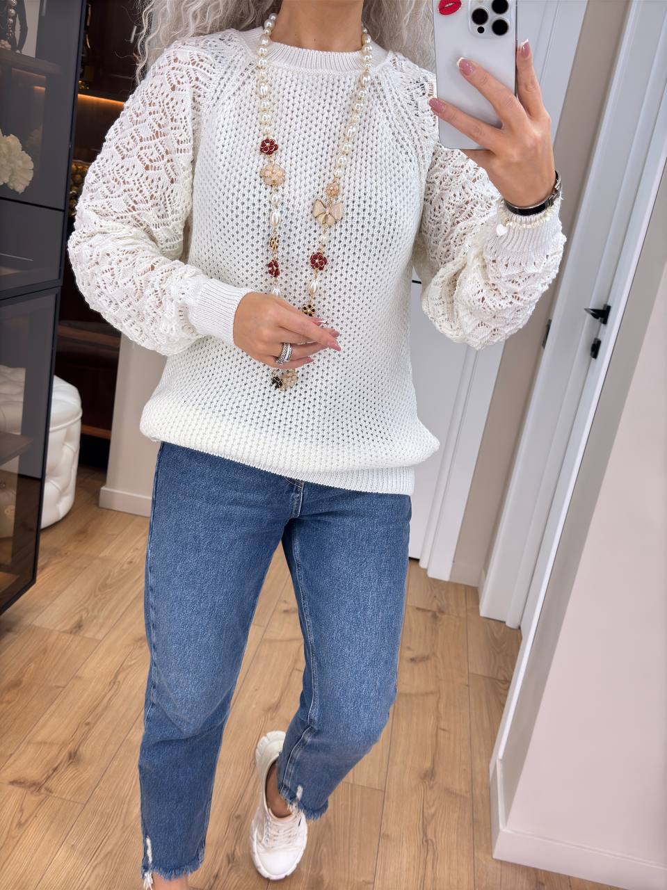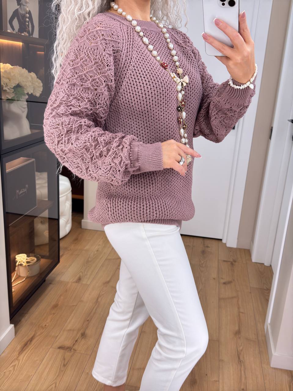 - Женский свитер с ажурными рукавами