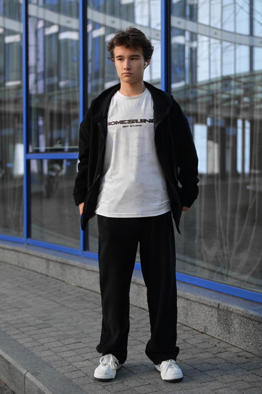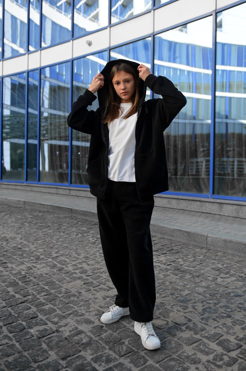 - Брюки Прямые в поясе резинка и шнурок который помогает корректировать объем. Шнурок на капюшоне