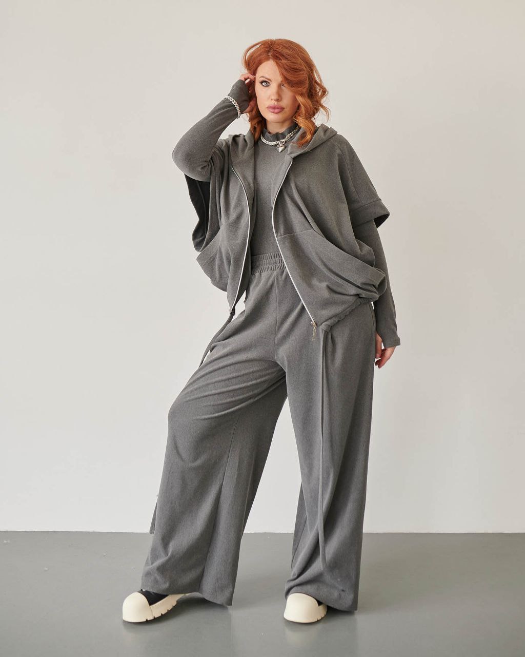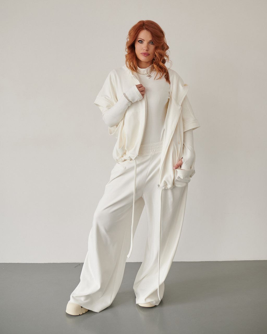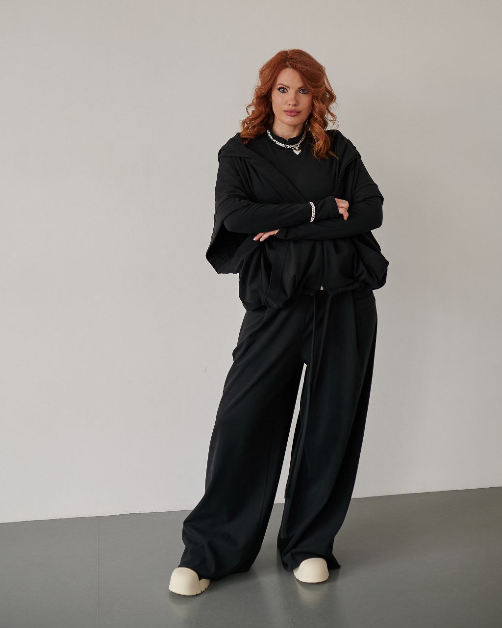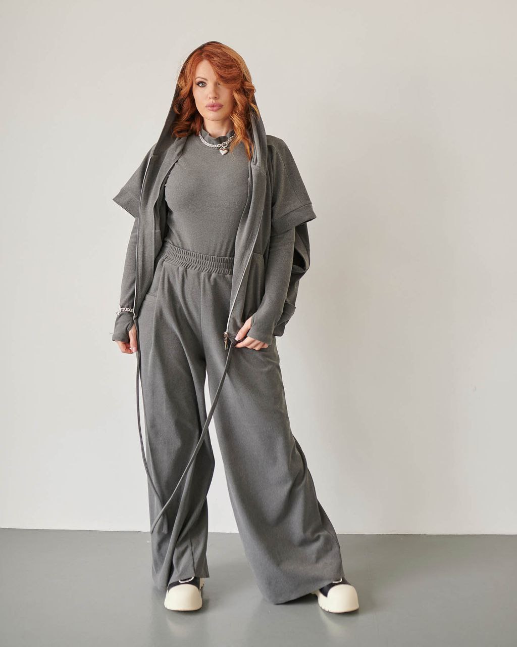 - Жилетка оверсайз, брюки палаццо, боди застегивается на кнопки, на рукаве есть вырез для пальчика