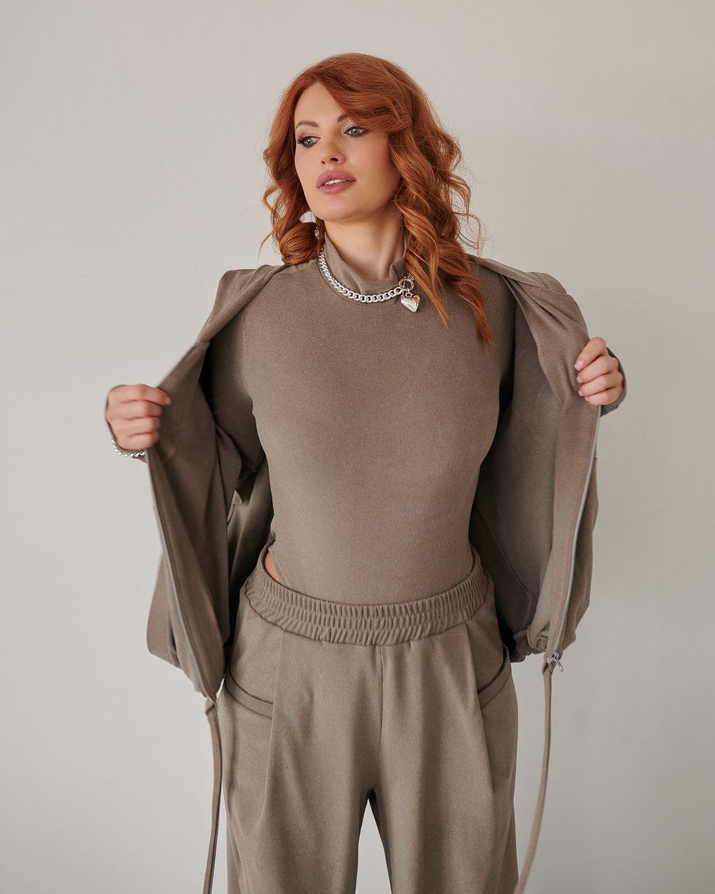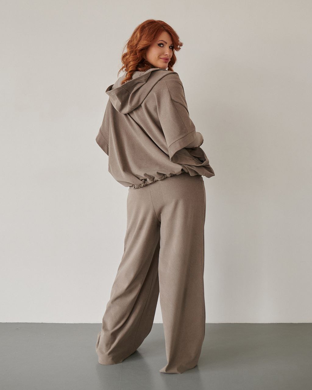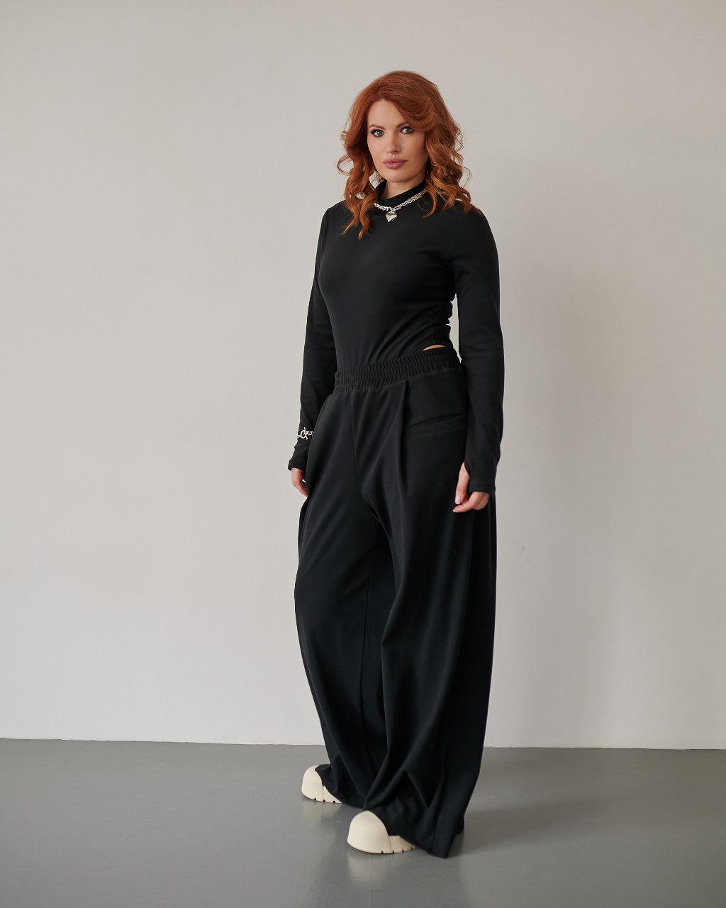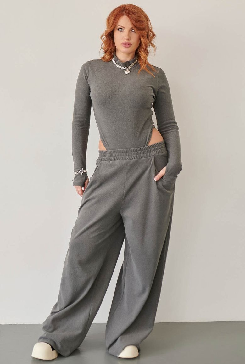 - Жилетка оверсайз, брюки палаццо, боди застегивается на кнопки, на рукаве есть вырез для пальчика