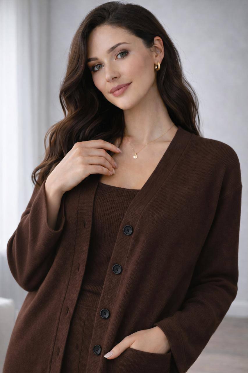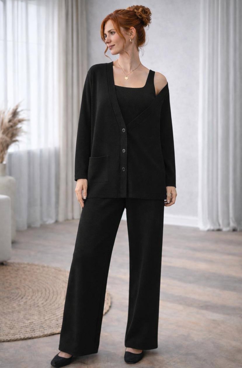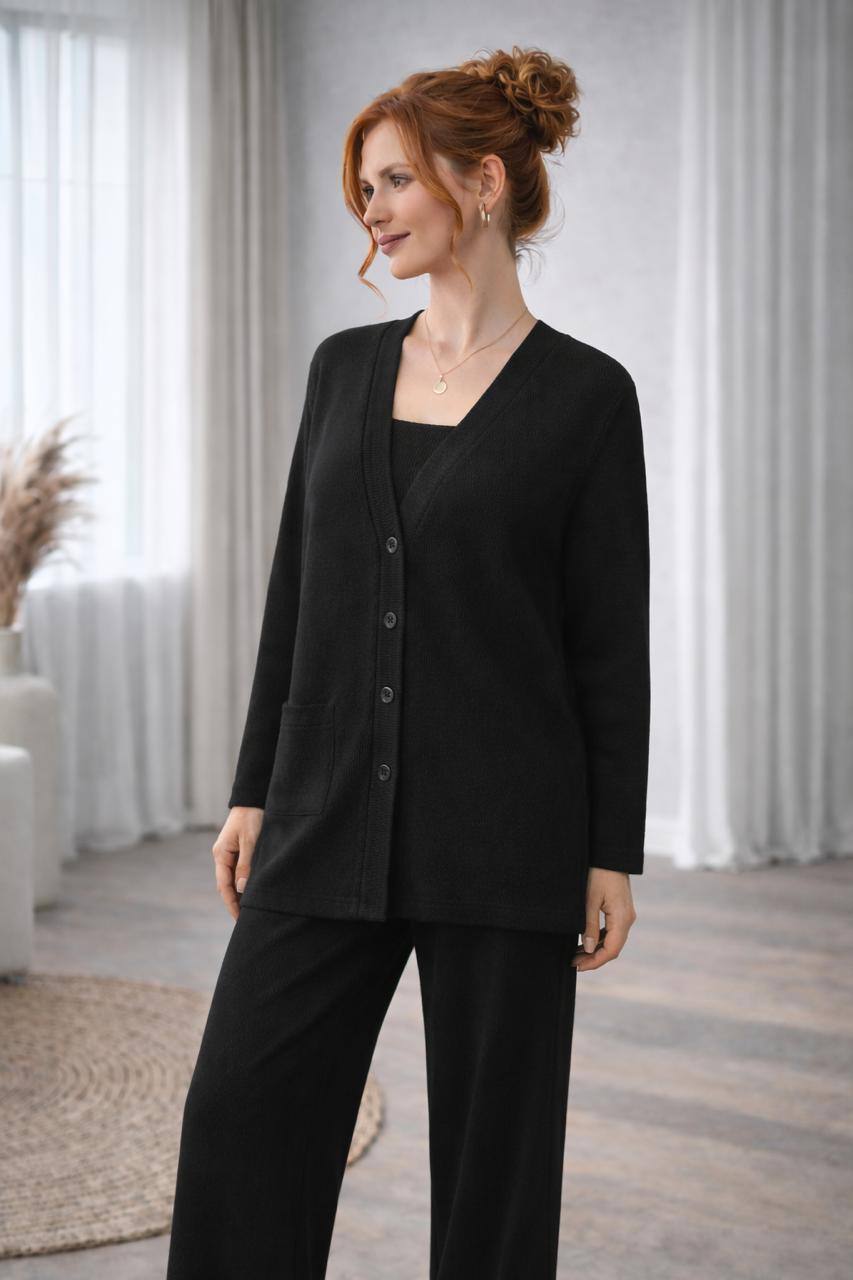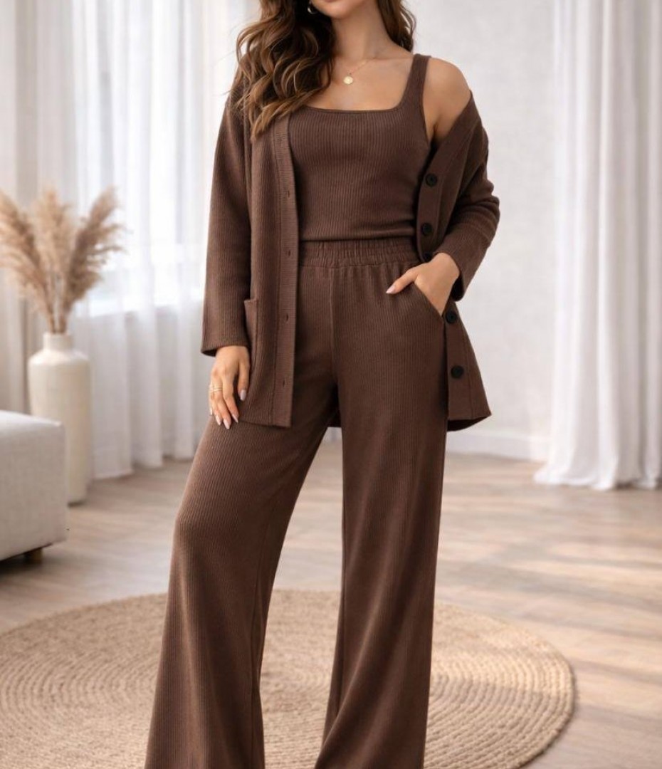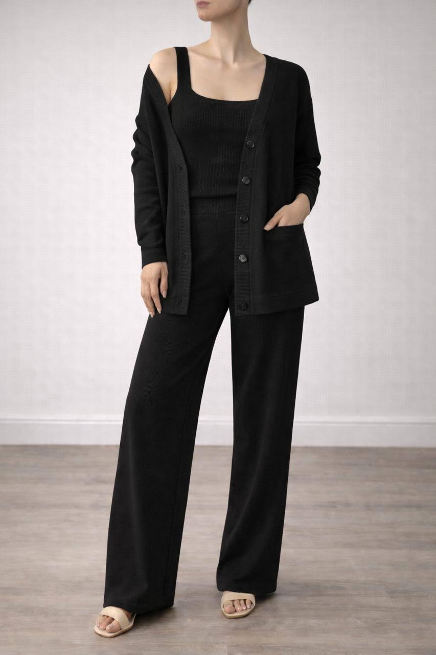 - Костюм тройка топ, брюки и кардиган