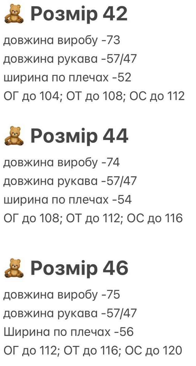 | 3XL | 46 | 52 | 102-106 | 82-86 | 110-114 |