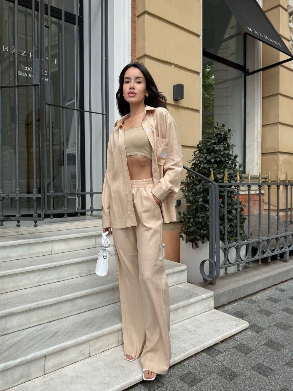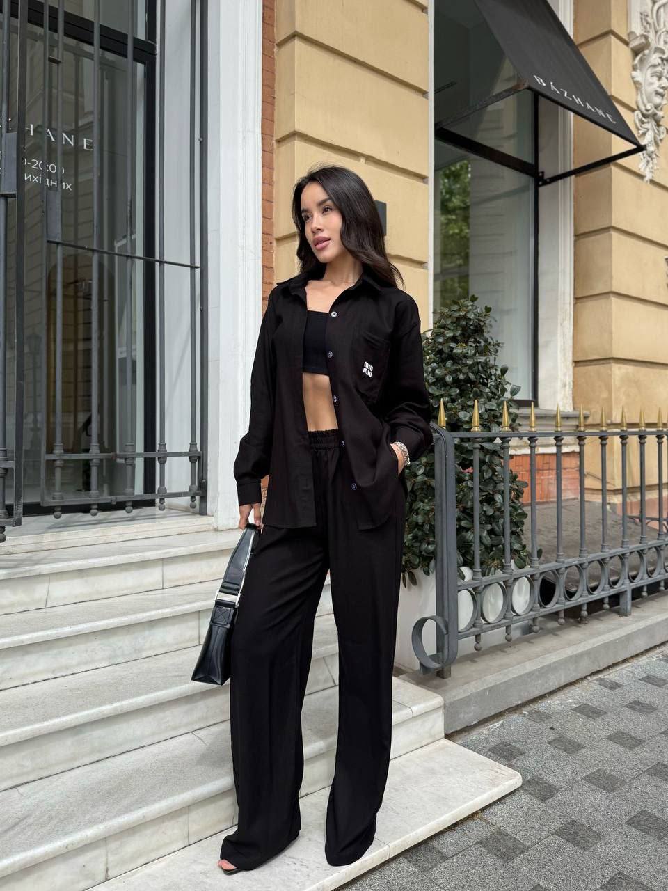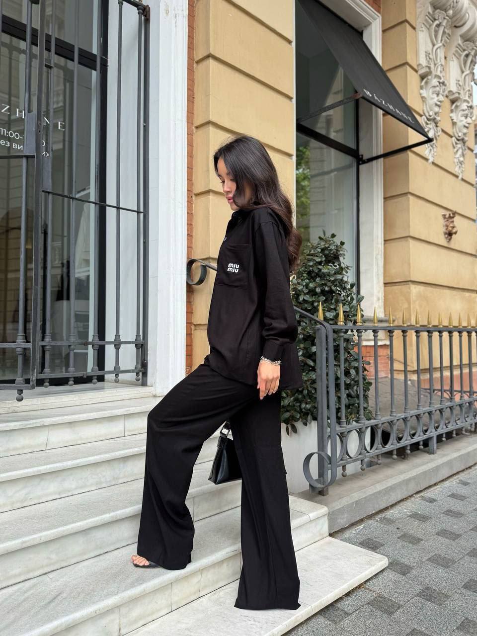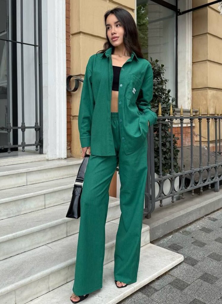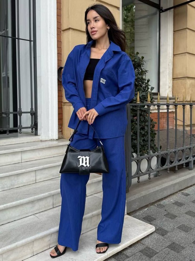 - Свободная рубашка и брюки прямого кроя