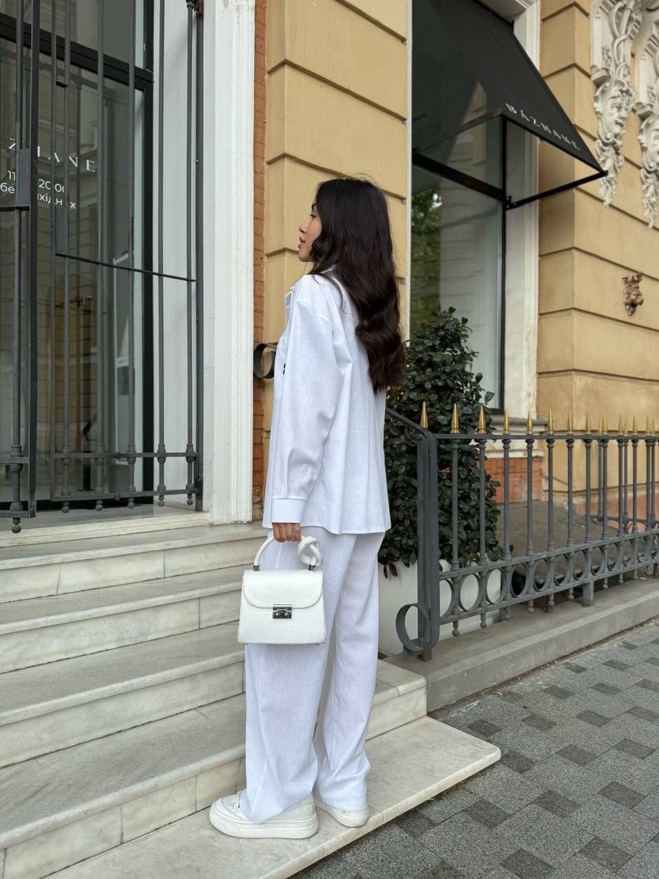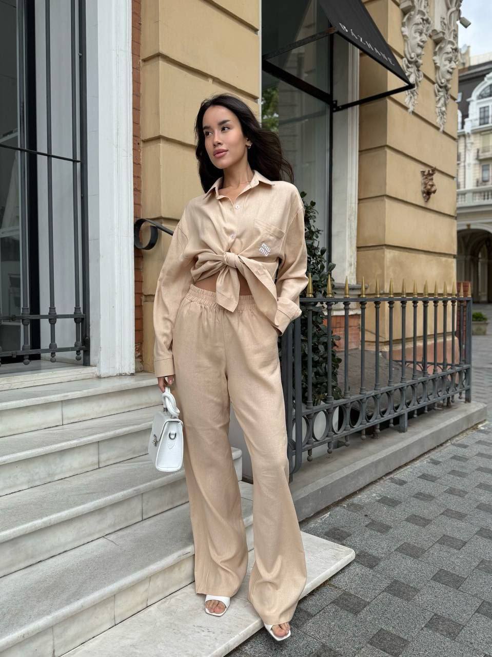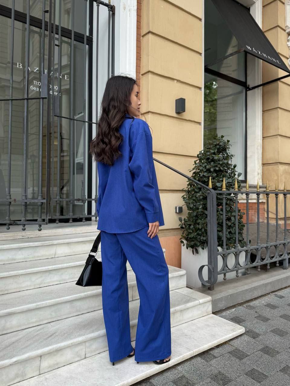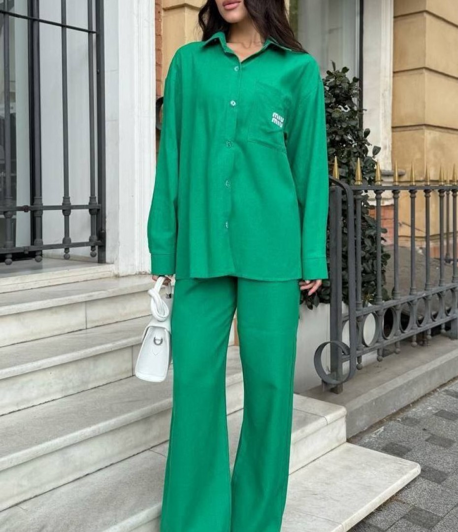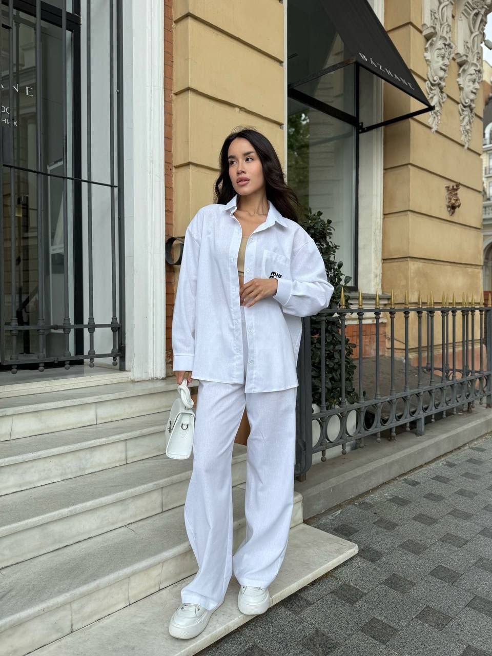 - Свободная рубашка и брюки прямого кроя