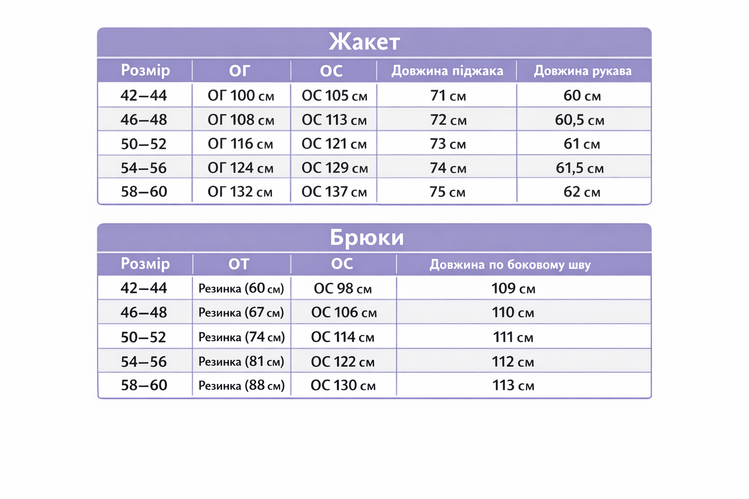 - Розмір: 42-44, 46-48, 50-52, 54-56, 58-60