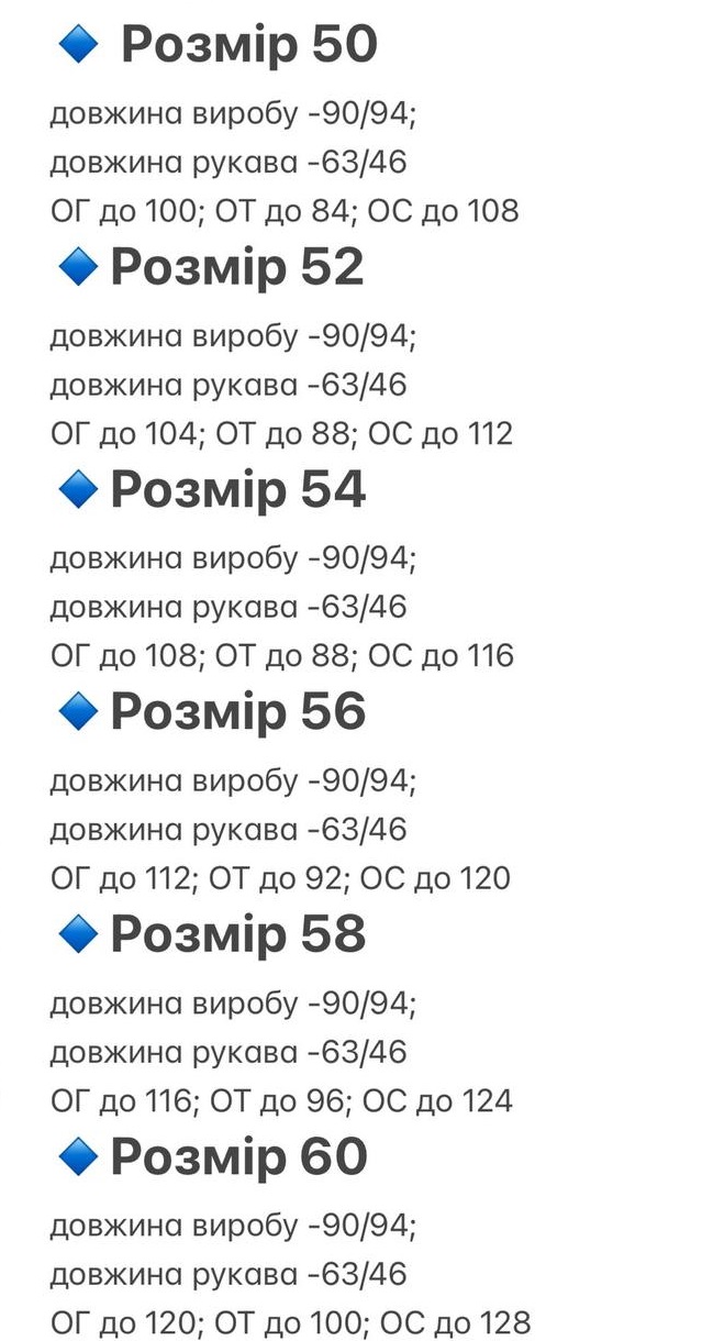 - Розміри: 50, 52, 54, 56, 58, 60