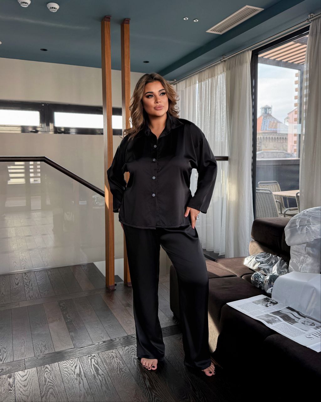 - 54-56 Об'єм грудей - 120 см, Довжина сорочка - 70 см, Довжина рукава - 56 см, Об'єм талії (довжина гумки) - 86 см (розтягується до 126 см), Об'єм стегон - 126 см, Довжина штанів - 109 см