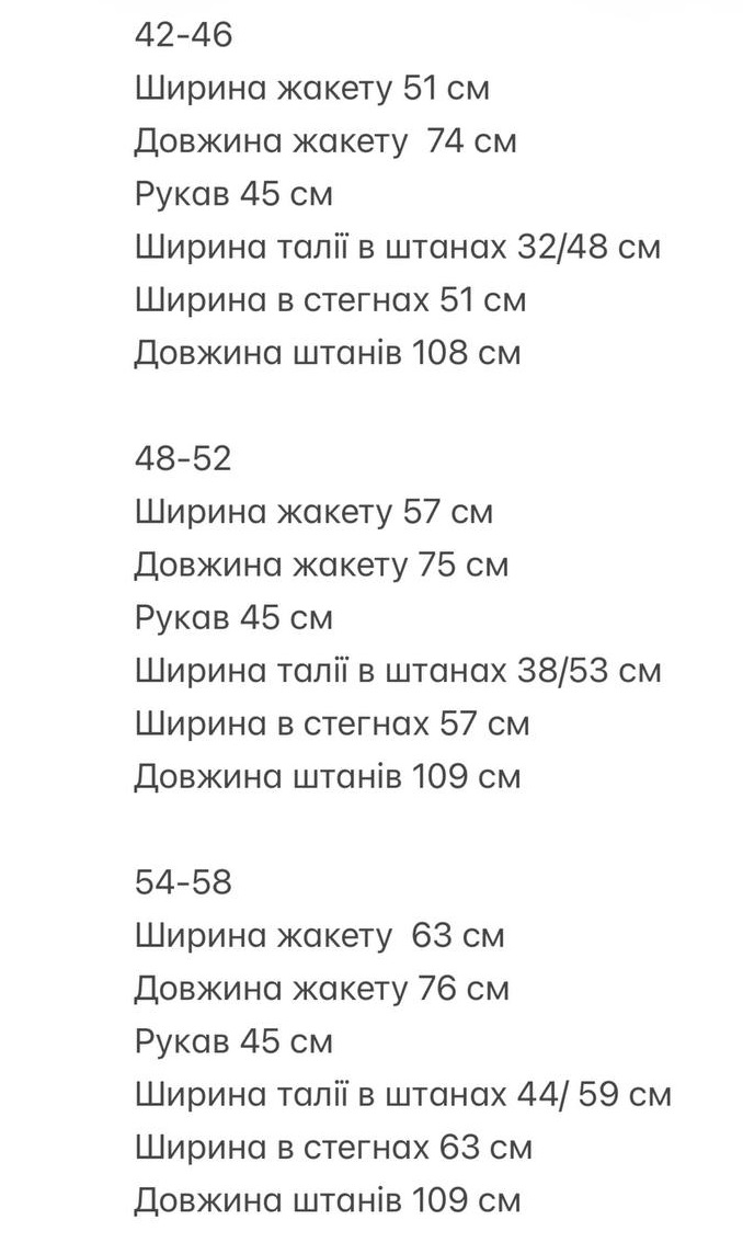 | 4XL | 48 | 54 | 106-110 | 86-90 | 114-118 |