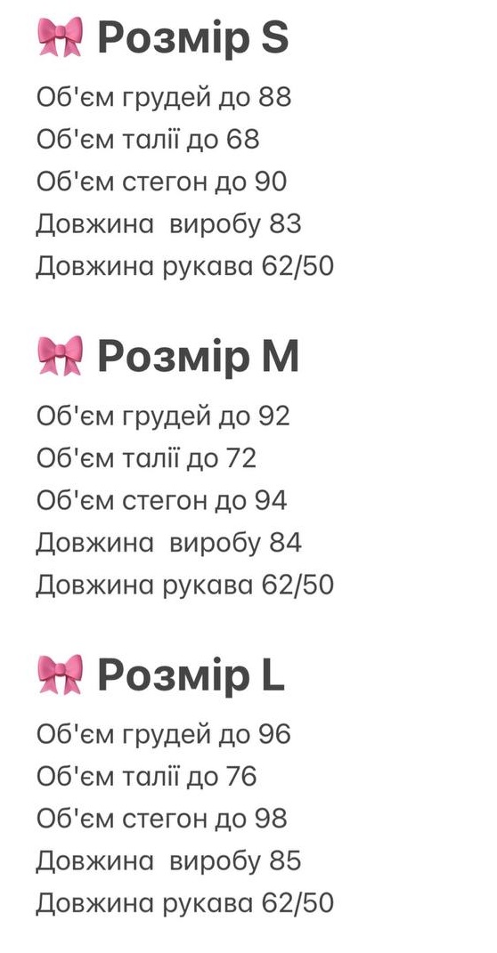 - Розміри: S, M, L