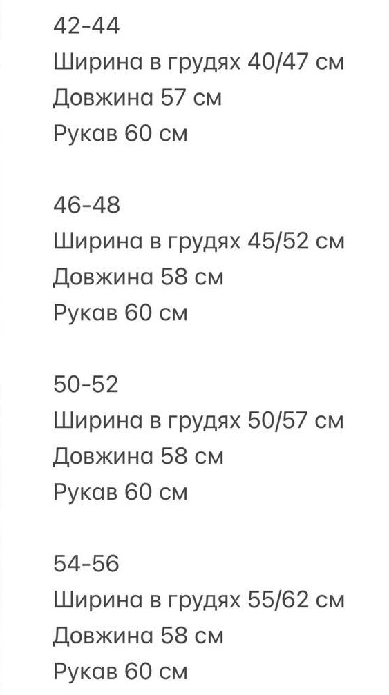 - Розміри: 42-44, 46-48, 50-52, 54-56