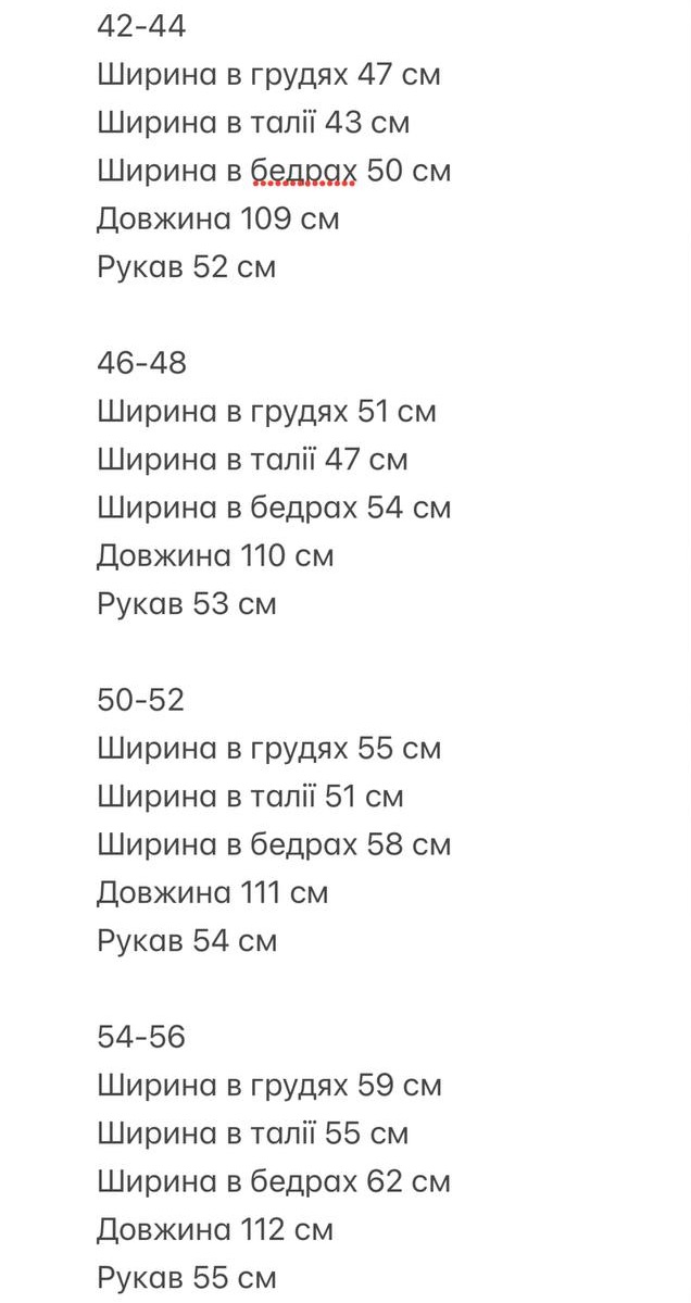 - Розміри: 42-44, 46-48, 50-52, 54-56