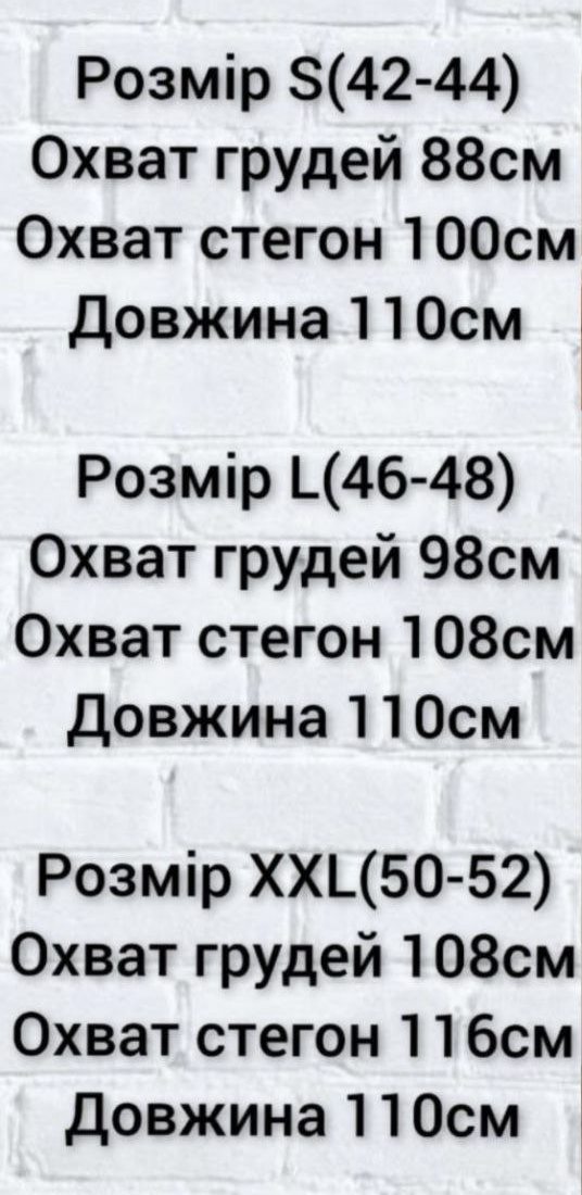 - Розміри: S (42–44), L (46–48), XXL (50–52)