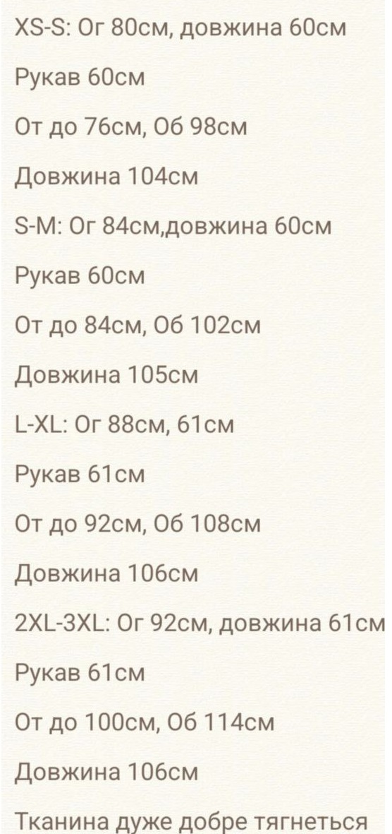 - Розміри: XS-S(40-42), S-M (42-44), L-XL (46-48), 2XL-3XL (50-52)