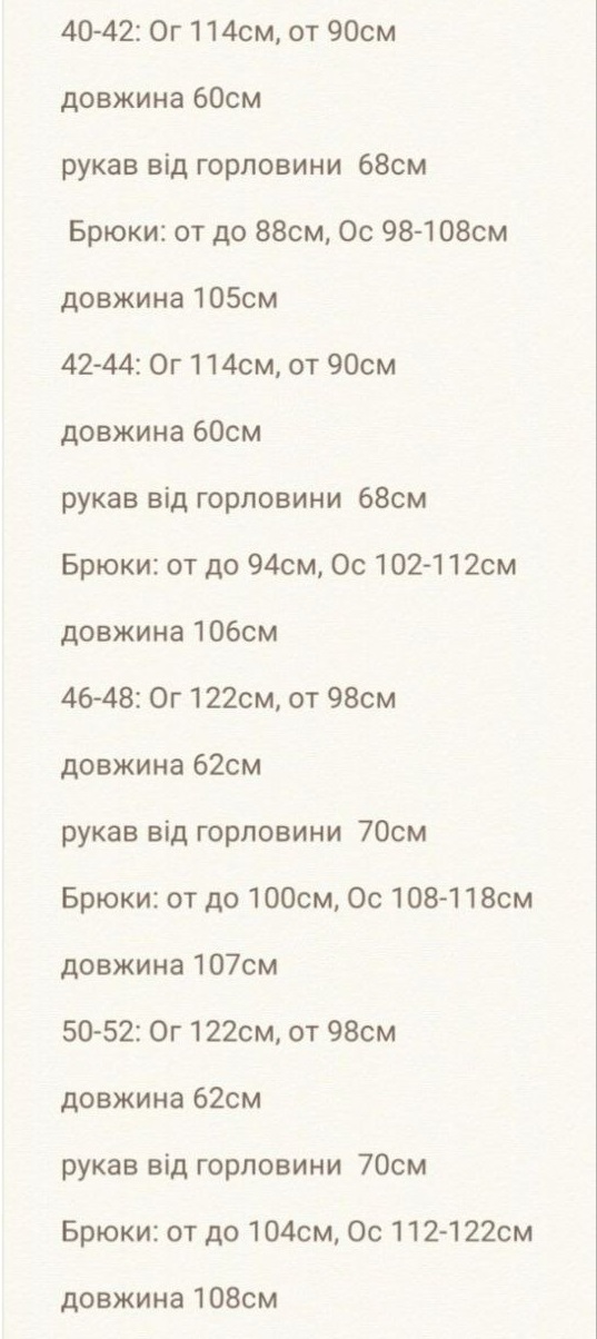 - Розміри: XS-S(40-42), S-M(42-44), L-XL(46-48), 2XL-3XL(50-52)