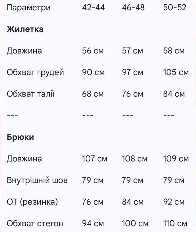 - Розміри: 42-44, 46-48, 50-52