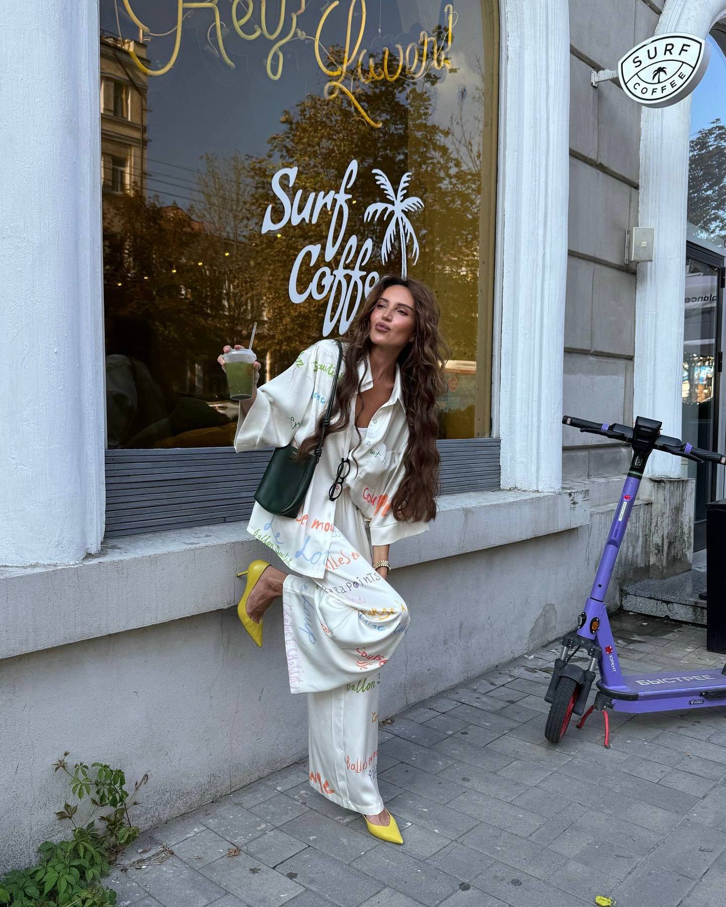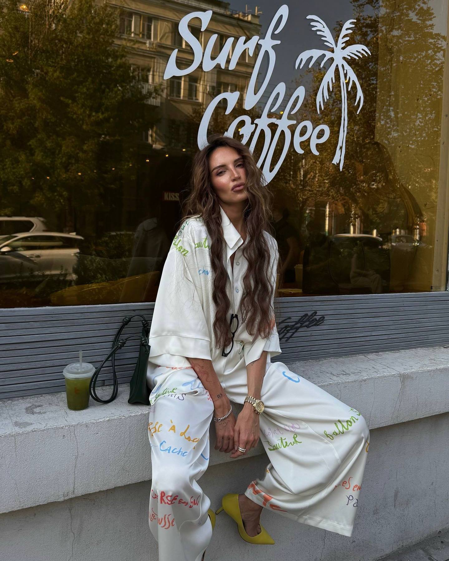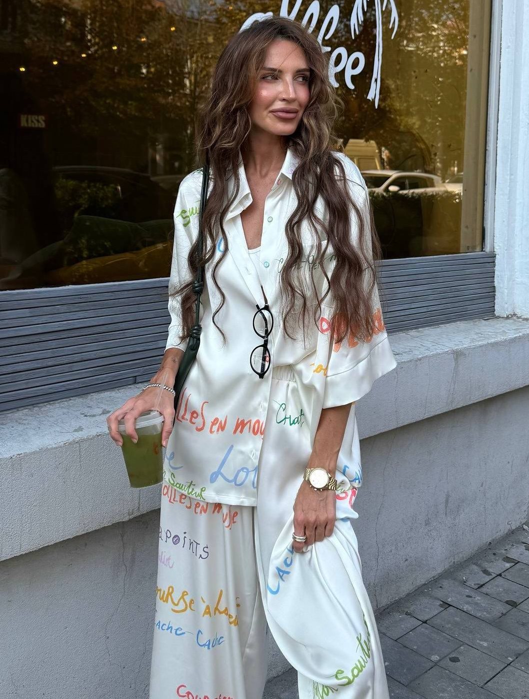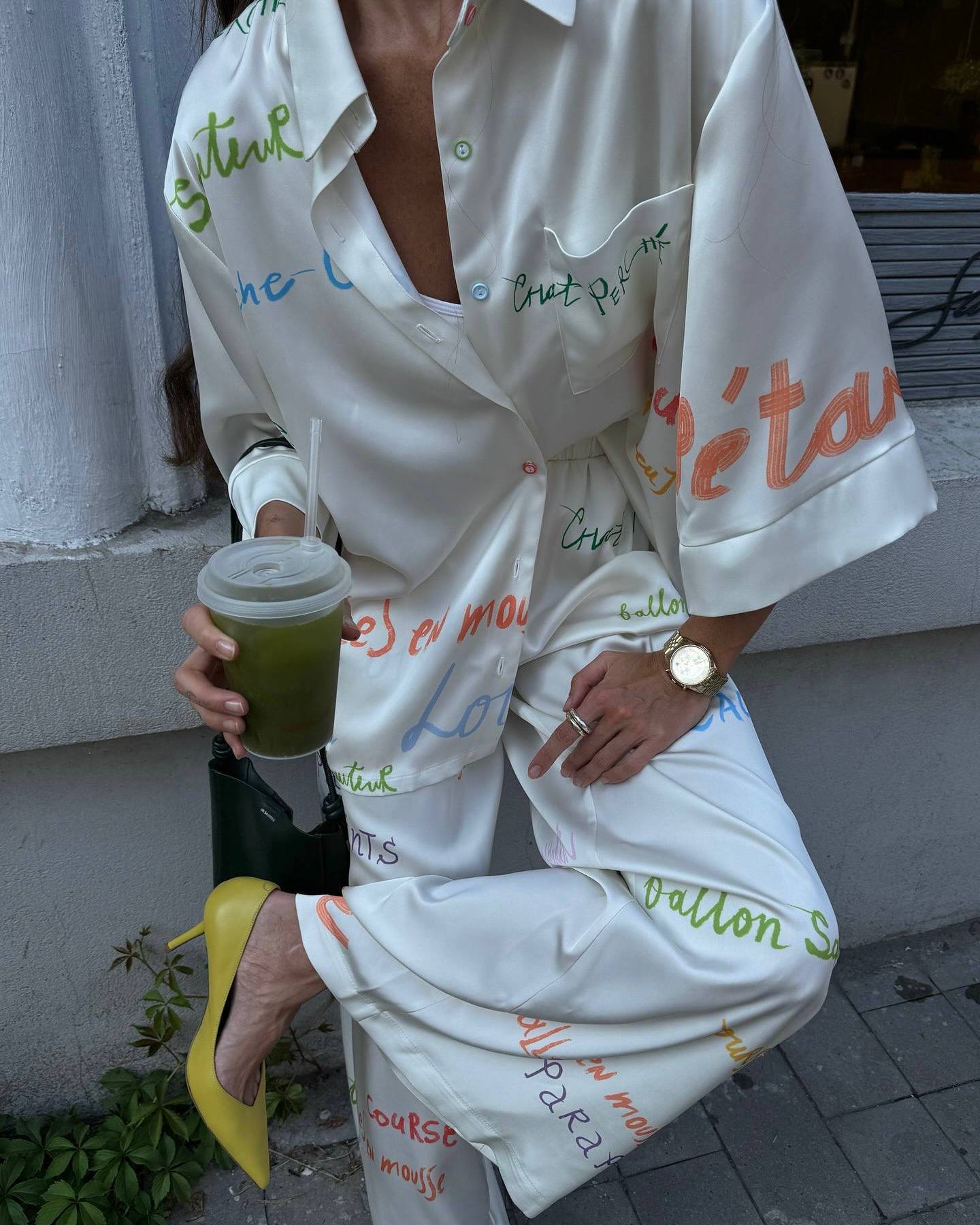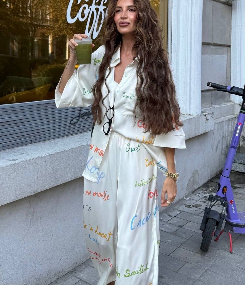 - Шовковий брючний костюм з надпісями