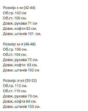 - Розмір: с-м (42-44), м-л (46-48), л-хл (50-52)
